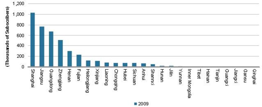 IPTV服務目前已擴展到中國的20多個省市,但IPTV用戶只集中在少數幾個地區。在中國的22個省中,IPTV用戶超過10萬的不到八個。而且,全部IPTV用戶中有整整56%只集中在三個地區:中國最大城市上海,以及人口密集的東部省份江蘇和南部省份廣東。