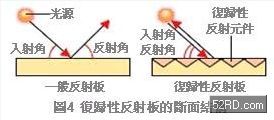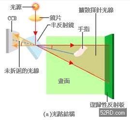此時若在顯示器周圍設置復數個收光器,勢必會造成觸控面板制作成本暴增,有鑑于此,研究人員在顯示器周圍黏貼「復歸性反射板(ReturnReflectorSheet)」,它可以反射來自顯示器周圍任何方向的光線,亦即從感測器射出的任何光線都會折返至感測器,如果被筆或是手指遮蔽時,光線就不會折返至感測器(圖4)。