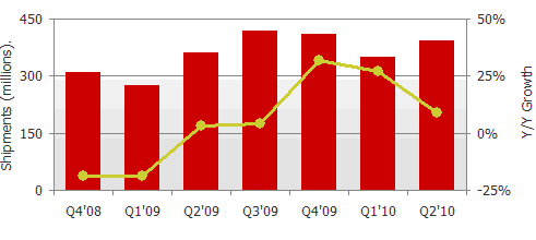 根據(jù)DisplaySearch最新一季手機面板出貨與預(yù)測報告指出,手機市場在2009年Q4強勁反彈,2009年手機面板全年出貨量達14億6千萬片,較2008年成長4.4%。而第四季手機面板出貨量為4億零9百萬片,較去年同期成長32%。雖然出貨量呈現(xiàn)正成長,但由于面板價格持續(xù)下滑的情況下,出貨金額僅達116億美元,較去年同期下跌4.7% 。