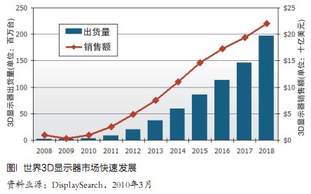 市場(chǎng)研究公司DisplaySearch日前發(fā)表一份專門報(bào)告稱,在3D電影成功的促動(dòng)下,3D顯示器市場(chǎng)將于2010年開(kāi)始起飛,預(yù)測(cè)3D顯示器出貨量將從2008年的70萬(wàn)個(gè)增長(zhǎng)到2018年的1.96億個(gè),10年內(nèi)年均增長(zhǎng)率達(dá)75%,同期銷售額從9億美元增長(zhǎng)到220億美元,年均增長(zhǎng)率38%(圖1)。世界消費(fèi)電子廠商將隨著推出一批3D有關(guān)產(chǎn)品,包括電視機(jī)、監(jiān)視器、筆記本電腦、藍(lán)光盤播放器、數(shù)碼相機(jī)、攝像機(jī)、相框等進(jìn)軍家庭市場(chǎng)。加上立體顯示原來(lái)就有的醫(yī)療等專業(yè)應(yīng)用以及廣告、公共顯示牌等應(yīng)用,都會(huì)成為促動(dòng)顯示產(chǎn)業(yè)開(kāi)始從平板產(chǎn)品向著3D大進(jìn)軍,這也是一次從平板顯示轉(zhuǎn)向立體顯示的革命。