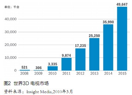 Insight Media市場(chǎng)研究公司3月發(fā)表的最新報(bào)告更加樂(lè)觀,預(yù)測(cè)世界3D電視市場(chǎng)將從今年的340萬(wàn)臺(tái)飚升到2015年的4965萬(wàn)臺(tái),增長(zhǎng)10倍還多(圖2),屆時(shí)占有率將超過(guò)20%。其對(duì)手公司iSupp1i公司尤其樂(lè)觀,認(rèn)為同期世界3D電視市場(chǎng)將從420萬(wàn)臺(tái)竄升到7800萬(wàn)臺(tái),占有率達(dá)40%,銷售額644億美元。
