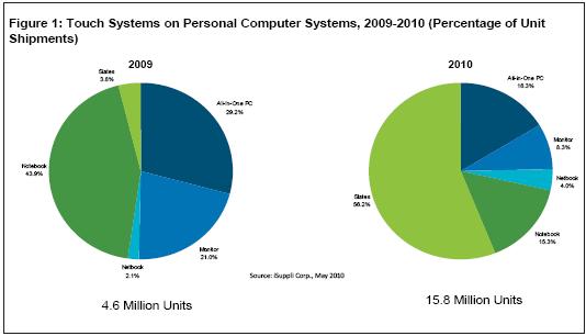 最近幾年,個人電腦市場對于觸摸屏的需求不斷增長,2008和2009年增長率超過20%,快于總體系統(tǒng)市場。但與該市場2010年462%的增長率相比,上述增長速度就相形見絀了。平板觸摸電腦是PC觸摸革命中的主要初期推動者,預計占PC觸摸市場的比例將從2009年的3.8%銳升到56.2%,而總體PC觸摸市場規(guī)模將擴大兩倍。