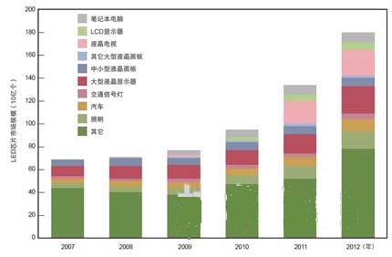 圖中為分用途的LED市場預(yù)測。設(shè)想到2012年以前,LCD TV市場將以年率120%增長。圖由依DisplaySearch的資料所制。