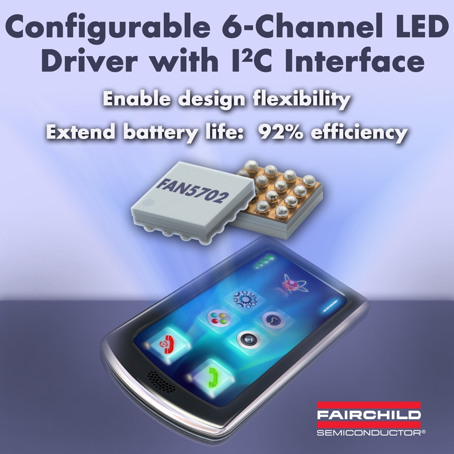 FAN5702是具有I2C 接口的可配置、180mA、6通道LED驅動器,可提供以下優勢: