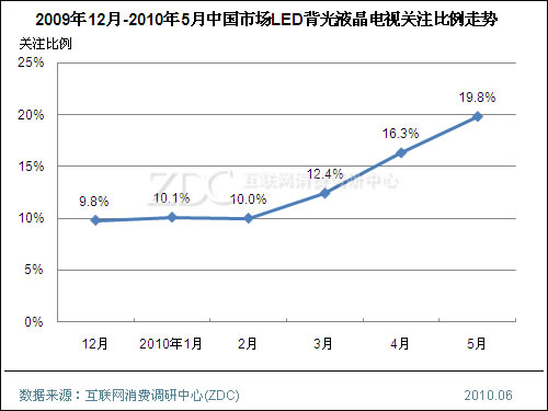 自2009年下半年開始,LED背光液晶電視開始放量增長,各大品牌均提高了LED背光在新品中的應用比例。自2010年3月起,LED背光液晶電視的消費者關注比例開始快速上升,到5月已經增加到19.8%,較年初提高近一倍。