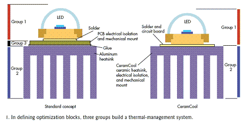 如圖1所示,Group1是LED本身,大體上仍是不能觸摸。中心位置是LED裸片以及一個將該裸片與LED底部連接起來的散熱銅條。從熱的角度講,理想方案是將LED裸片直接與散熱器綁定在一起。由于大規模生產的原因,這一概念在商業上行不通。我們把LED看作一個標準化的“目錄”產品,不能做改動。它是個黑盒子。