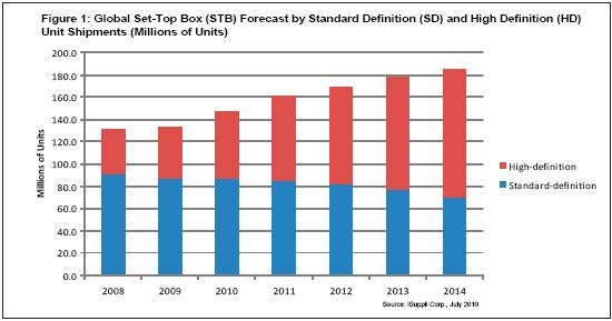 高清STB的出貨量最近幾年保持快速增長。2009年,高清STB出貨量增長600萬個以上,從2008年的3910萬個增長到4520萬個。到2012年,高清STB出貨量將首次超過標清(SD)STB。到2014年,高清STB將達到1.14億個,復(fù)合年度增長率為20.3%。