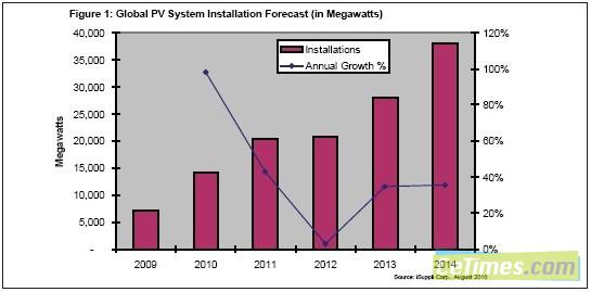 預(yù)計今年全球光伏裝機容量將增長到14.2GW,比2009年的7.2GW大增97.2%,而且也沒有明年降溫的跡象。圖1所示為2009-2014年全球光伏裝機容量預(yù)測,2014年新增光伏系統(tǒng)預(yù)計將達到38.1GW。