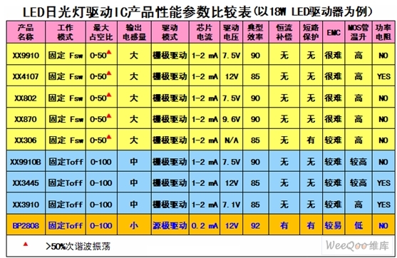 表1LED日光燈驅動IC產品性能參數比較表