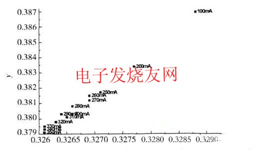 現在LED的發光顏色越來越豐富,LED的色坐標參數是LED重要的物理參數之一,隨著注入電流的增加,器件出光的色坐標在一定程度上減小,如圖1所示。