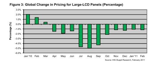 據IHS iSuppli公司的研究,由于需求疲軟和庫存上升,2月份大型液晶顯示器(LCD)面板價格繼續下降,但到4月份這種情況可能會有所改善,因屆時品牌廠商會增加購買電視面板。