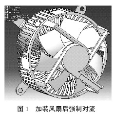 主動散熱常用液冷、熱管、風冷等方式。由于液冷使用的液體必須在泵的帶動下強制循環帶走散熱器的熱量,熱管則依靠高導熱性能的傳熱元件在全封閉真空管內的液體的蒸發與凝結來傳遞熱量,二者都不適合車燈內使用。風冷散熱具有價格較低、安裝簡單等優點最為常用。針對被動散熱方式存在的散熱器中心區域溫度相對集中的情況,加裝風扇強制對流后(見圖1),對緩解散熱器溫度不均勻有明顯效果。