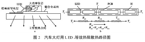 本文研究的汽車前大燈用LED是目前OSRAM公司最大功率的一種LEUMD1W4;管芯散熱設計選用了一種更利于散熱的LE3S封裝。這種封裝的特點是,以面積較大的銅合金散熱墊為基座,管芯固定在基座中央。同時將LED基座與鋁基板接觸區域的絕緣介質剝離,使銅合金基座與鋁基板直接接觸。基座上的熱直接傳導至LED的外部。這種內部結構去處了管芯和基座之間的介質減少了熱阻,更直接地將管芯的結溫導出(見圖2a)。