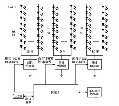 以FPGA作為控制器,根據(jù)上位機(jī)的調(diào)光指令調(diào)整PWM 占空比,從而控制背光亮度;采樣顏色傳感器的數(shù)據(jù),微調(diào)橙燈和藍(lán)燈的PWM 占空比,保證在溫度發(fā)生變化時色溫不變。