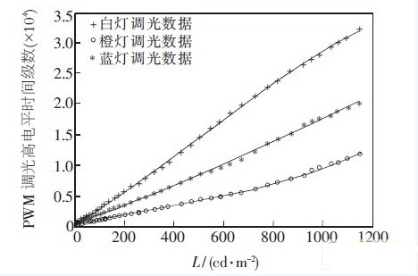 圖3為SS-230平板顯示綜合分析系統(tǒng)的照片。實(shí)驗(yàn)時,調(diào)白光從低亮度到高亮度,橙燈和藍(lán)燈也按比例逐漸增加,保證色溫在(6 500±30)K,色坐標(biāo)u′=0。198,v′=0。468。記錄從低亮度到高亮度調(diào)光過程中,白燈、橙燈和藍(lán)燈的調(diào)光PWM波形高電平持續(xù)時間的數(shù)據(jù),共記錄40組數(shù)據(jù)。