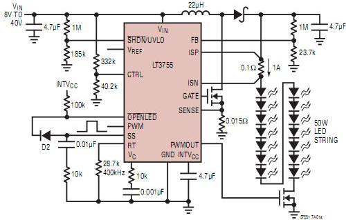 大多數(shù)前燈應用需要約 50W LED 電流。凌力爾特公司的 LT3755 設計成服務于這種類型的應用。它可以將汽車總線電壓(標稱值為 12V)提高到 60V,以驅(qū)動多達 14 個串聯(lián)連接的 1A LED,如圖1所示。