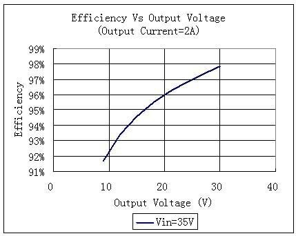 圖中的輸入電壓為35V,輸出電流為2A,當輸出電壓為30V時,效率可以高達97.8%。但是當輸出電壓降低到20V時,效率就降為96%;當輸出電壓降低為10V時,效率就降低為92%。在這三種情況下,盡管其輸出功率依次為60W,40W和20W,但是其損耗功率卻依次為1.2W,1.6W,1.6W。后兩種情況下功耗增大了33%。假如恒流模塊的散熱系統設計得非常臨界,增加33%的耗散功率就有可能會使芯片的結溫升高,以致發生過溫保護而無法工作,嚴重時也有可能使芯片燒毀。