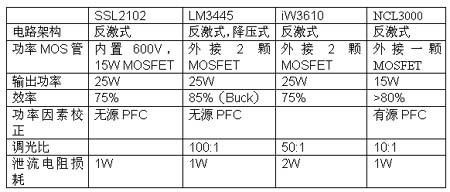 目前市場上主要有恩智浦的SSL2101/2,國半的LM3445,iWatt的iW3610和OnSemi的NCL3000四種兼容可控硅調光的驅動IC。其特點如下: