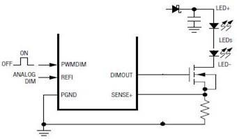 具體實現PWM調光的方法就是在LED的負載中串入一個MOS開關管(圖8),這串LED的陽極用一個恒流源供電。