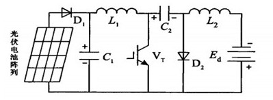 充電控制器作為光伏電池和鉛酸蓄電池的接口電路,一般都希望讓其工作在最大功率點(diǎn),實(shí)現(xiàn)更高的效率,但是在實(shí)現(xiàn)最大功率點(diǎn)跟蹤(MPPT)的同時(shí),還需要考慮進(jìn)行蓄電池充電控制。目前常用的主電路拓?fù)渲饕薪祲盒碗娐罚˙uck)變換器、升壓型電路(Boost)變換器、丘克電路(Cuk)變換器等。一般光伏電池輸出電壓波動較大,而Buck變換器或Boost變換器只能進(jìn)行降壓或升壓變換,受此影響,光伏電池不能在大范圍內(nèi)完全工作于最大功率點(diǎn),從而造成系統(tǒng)效率下降。同時(shí),Buck變換器輸入電流紋波較大,如果輸入端不加一個儲能電容就會使系統(tǒng)工作在斷續(xù)狀態(tài)下,從而導(dǎo)致光伏電池輸出電流時(shí)斷時(shí)續(xù),不能處于最佳工作狀態(tài);而Boost變換器輸出電流紋波較大,用此電流對蓄電池進(jìn)行充電,不利于蓄電池的使用壽命;Cuk變換器同時(shí)具有升壓和降壓功能,將Cuk變換器應(yīng)用于光伏系統(tǒng)充電控制器中,可以在較大范圍內(nèi)實(shí)現(xiàn)最大功率點(diǎn)跟蹤,有利于系統(tǒng)效率的提高。因此,常選用Cuk變換器作為充電控制器的主電路,其系統(tǒng)拓?fù)淙鐖D7所示。