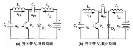 此期間開關(guān)管Vr導(dǎo)通,電容C2上的電壓使二極管D2反偏而截止,這時(shí)輸入電流iL2使Ll儲能;C2的放電電流iL2使L2儲能,并供電給負(fù)載,如圖8(a)所示。