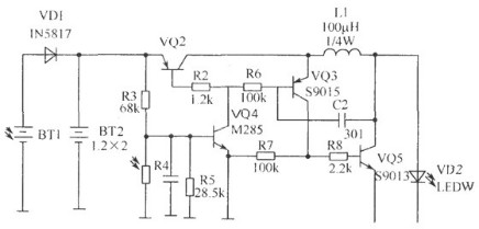 該電路的工作原理:白天有太陽光時(shí),由BT1把光能轉(zhuǎn)換為電能,由VD1對BT2充電,由于有光照,光敏電阻呈低阻,VQ4 b極為低電平而截止。當(dāng)晚上無光照時(shí)光敏電阻呈高阻,VQ4導(dǎo)通,VQ2 b極為低電平也導(dǎo)通,由VQ3、VQ5、C2、R6、L1組成的DC升壓電路工作,LED得電發(fā)光。