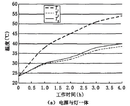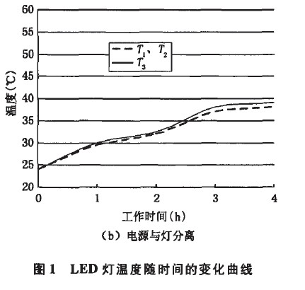 由于電源本身產(chǎn)生一定的熱量,使得LED燈上的熱量來源增加。同時(shí),電源與燈一體設(shè)計(jì)使得LED燈整體受熱不均,這些因素都會(huì)導(dǎo)致燈具發(fā)生疲勞和早期失效,而影響其壽命。圖1為L(zhǎng)ED燈溫度隨工作時(shí)間的變化曲線,圖中T1為放置電源處溫度,T2為遠(yuǎn)離電源處溫度,T3為燈體中心溫度。從圖中看出,隨著工作時(shí)間的增加,圖1(a)中T1遠(yuǎn)大于T2和T3;圖1(b)中T1與T2兩曲線重合,T3略大于T1和T2。可見分離電源后,整燈的溫度分布很均勻。