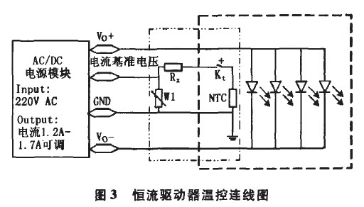 圖3為恒流電源給LED燈供電控制原理圖。電源的指標(biāo)為:220V AC輸入,電流1.2一1.7A可調(diào),電壓自適應(yīng)(36~39V)。圖3中左側(cè)細(xì)虛線框中部分為控制電路,其中W1為可調(diào)電阻器;NTC為負(fù)溫度系數(shù)熱敏電阻;Kt為常開溫度繼電器,其閉合溫度為56℃,自動(dòng)斷開溫度為45℃;Rx為匹配電阻。圖3右側(cè)粗虛線框中部分為L(zhǎng)ED模塊部分。溫度繼電器和熱敏電阻安裝在LED模塊上,并與模塊緊密接觸,以便將LED的溫度信息反饋給控制電路。常溫下Kt