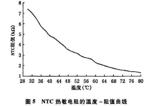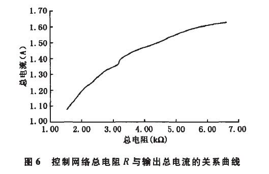 控制電路阻值與輸出總電流的關(guān)系列于表1,其中R為控制電路的等效電阻。經(jīng)過在恒溫箱中測(cè)試,每2℃記錄1組數(shù)據(jù)得到如圖5所示的NTC熱敏電阻的溫度一阻值曲線。該方案中,驅(qū)動(dòng)電源通過接收到反饋的溫度信息來控制輸出電流,根據(jù)圖5中NTC的溫度與阻值的關(guān)系,只要找到輸出電流隨總阻值的變化關(guān)系(如圖6所示),再進(jìn)行適當(dāng)?shù)碾娮杵ヅ洌憧烧业綔囟扰c驅(qū)動(dòng)器輸出電流的關(guān)系。
