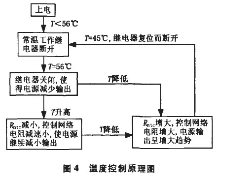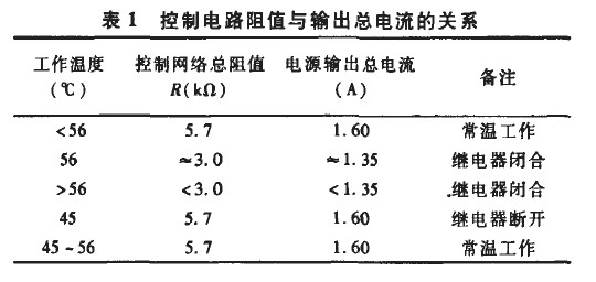 處于斷開狀態(tài),此時(shí)控制電路中只有W1起控制作用,設(shè)定常溫工作總電流恒定為1.60A。當(dāng)繼電器溫度上升到56℃時(shí),Kt自動(dòng)閉合,整個(gè)控制電路開始工作,以減小恒流電源的輸出;當(dāng)溫度降低到45℃時(shí),Kt自動(dòng)斷開,電源額定輸出。該過程可用圖4表示,圖中T為Kt的溫度,Rntc為NTC的阻值。