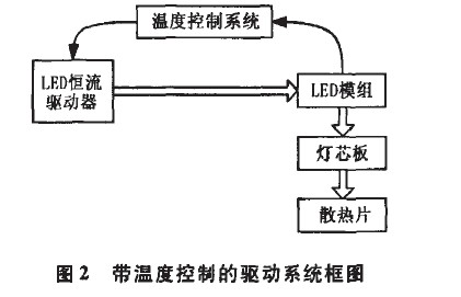 此方案通過控制驅(qū)動(dòng)器的輸出電流來實(shí)現(xiàn)對(duì)LED燈的溫度控制。圖2為恒流驅(qū)動(dòng)器驅(qū)動(dòng)LED燈框圖,驅(qū)動(dòng)器輸出到LED模組,LED模組上產(chǎn)生的熱量通過良好的導(dǎo)熱材料傳導(dǎo)到燈芯板,最后經(jīng)由散熱片散熱到大氣中。當(dāng)外界散熱環(huán)境惡劣時(shí),LED模組的溫度會(huì)達(dá)到溫度控制系統(tǒng)設(shè)定的溫度,得到反饋的信息后,驅(qū)動(dòng)器減少輸出,達(dá)到限制并降低LED模組溫度的目的。