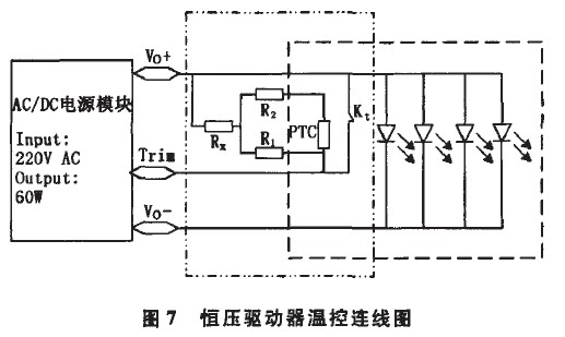 圖7為恒壓驅(qū)動(dòng)器溫控的連線圖。Trim端用來調(diào)節(jié)電源的輸出。左側(cè)點(diǎn)線型虛線框中部分為控制電路,其中:PTC為正溫度系數(shù)溫敏電阻;R1、R2、R,均為普通電阻,與PTC溫敏電阻匹配調(diào)節(jié)驅(qū)動(dòng)器輸出電壓;Kt為常閉型溫度繼電器,其斷開溫度為60℃,自動(dòng)閉合溫度為48%。右側(cè)虛線框中部分為L(zhǎng)ED模塊部分。Kt和PTC安裝在LED模塊上,并與模塊緊密接觸。常溫下Kt處于閉合狀態(tài),此時(shí)控制電路中控制驅(qū)動(dòng)器額定輸出,該LED模組常溫工作額定總電壓為24V。當(dāng)繼電器溫度上升到60℃時(shí)Kt