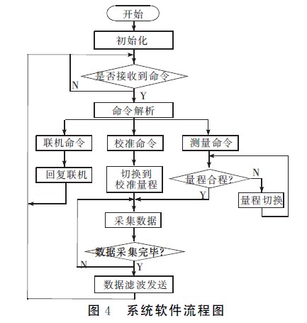 系統軟件采用C語言編寫,在IAR公司提供的集成調試環(huán)境Workbech下采用模塊化思想進行設計。系統的軟件程序固化在MSP430F149單片機的內部Flash存儲器中。系統的程序流程如圖4所示。整個流程可分為初始化、命令解析、數據測量、數據處理及顯示程序。程序設計借鑒實時操作系統的思想,劃分事件和目標。系統按照工作過程共有命令解析、聯機、校準、測量判斷、數據采集、數據打包發(fā)送等幾個事件,通過對事件的處理來完成相應的功能,并進行必要的狀態(tài)轉換。當電壓改變后,接收到測量命令,進入測量狀態(tài),將數據發(fā)送并顯示,回到空閑狀態(tài)繼續(xù)等待命令然后進行相應的操作。