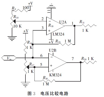 放大后的電壓Vin分別輸入單片機A/D通道和由LM324組成的上下限電壓比較器,根據比較器輸出分析信號幅度是否在規(guī)定范圍內。為了使電路工作更穩(wěn)定,比較電壓值需預留一定的豁量。如圖3所示,調節(jié)R10使比較上限電壓為2.3V,調節(jié)R17使比較下限電壓為0.1V,當Vin在0.1~2.3V時,量程合適,比較器輸出邏輯電平00,啟動A/D轉換電路。否則,當Vin>2.3V時,通過模擬開關MAX312并配合軟件來切換I/V轉換電路的反饋電阻,向大量程切換;當Vin<0.1V時,向小量程切換,以適應不同強度的光信號。