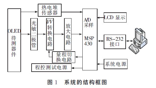 針對以上問題,本文設計了一套基于微控制器的OLED光電性能綜合測試系統,系統以微控制器為核心,是一個將精密恒壓(恒流)電源、電壓電流測量、溫度測量、亮度測量有機地結合在一起的測量系統,可實現測試條件設置、數據存儲、分析、圖形化顯示、打印輸出等功能,實現了對OLED器件光電性能的高精度快速自動測量,使OLED器件的光電性能測試工作變得方便、快捷、科學。