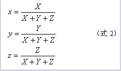 CIE XYZ 1931色度系統(tǒng)中的色坐標x, y, z與三刺激值XYZ之間的關(guān)系式如下: