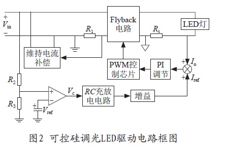 圖2是一種利用普通的脈寬調制PWM芯片結合外圍電路來搭建可控硅調光的LED驅動電路框圖。維持電流補償電路通過檢測R1端電壓(即輸入電流)來控制流過維持電流補償電路的電流。當輸入電流較小時,維持電流補償電路上流過較大的電流;當輸入電流較大時,維持電流補償電路關斷,維持電流補償以恒流源的形式保證可控硅的維持電流。調光控制電路包括比較器、RC充放電電路和增益電路。實驗中選用一款旋鈕行程和斬波角成正比的可控硅調光器,其最小導通角約為30°。