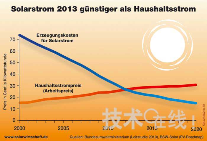 圖2:到2013年,太陽能發(fā)電成本將低于家庭電費。圖為德國太陽能發(fā)電的發(fā)電成本(藍線)與家庭電費(紅線)的比較。