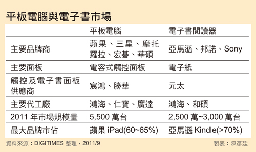 蘋果iPad系列持續(xù)在平板計算機市場一枝獨秀,爆發(fā)性成長讓各家電信、PC及手機制造廠趨之若鶩,由于平板計算機具備多媒體觸控特性,讓電子書閱讀器業(yè)者憂心忡忡,擔(dān)心平板計算機大軍崛起恐沖擊電子書市場,然蘋果憑借軟件、成本、價格與規(guī)模優(yōu)勢,陸續(xù)讓部分平板計算機業(yè)者知難而退,反觀電子書市場穩(wěn)定成長,供應(yīng)鏈廠商業(yè)績持續(xù)翻揚,平板計算機大軍暫難發(fā)揮影響力,讓電子書廠商暫時松了一口氣。就目前平板計算機品牌版圖來看,仍以蘋果iPad系列獨占鰲頭,業(yè)界預(yù)估2011年市占率約60~65%,其次是三星電子(Samsung Electronics),市占率約5~6%,其它各品牌廠市占分別落在1~3%,尤其是2011年初時被業(yè)界視為蘋果iPad殺手,未推出產(chǎn)品就先轟動的惠普(HP)、RIM及摩托羅拉(Motorola)等品牌廠,推出前預(yù)估出貨量很高,然這些憑借品牌及軟件平臺光芒的先頭部隊卻最先敗陣,讓現(xiàn)存平板計算機業(yè)者更加憂心。