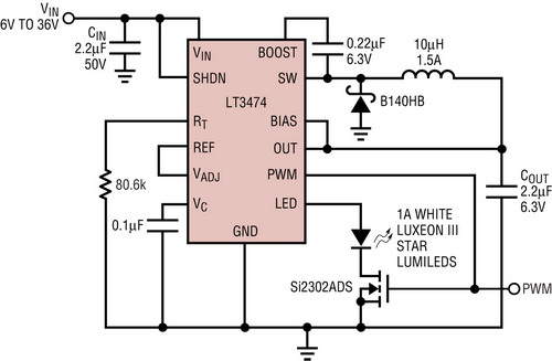 LED亮度可由圖1中的LT3474來控制,把一個(gè)模擬電壓輸入連接至VADJ引腳或把一個(gè)數(shù)字PWM信號輸送至PWM調(diào)光MOSFET的柵極和PWM引腳。簡單的模擬亮度控制通過降低內(nèi)部檢測電阻上的電壓,將恒定LED電流從1A降至更低的值,但是LED光線的顏色在低電流時(shí)會(huì)變化。調(diào)光比的實(shí)際限制大約為10:1。