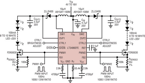 圖2是LT3486雙輸出升壓型LED驅(qū)動(dòng)器的應(yīng)用,它以100mA恒定電流驅(qū)動(dòng)兩串LED,LED電壓高達(dá)36V。