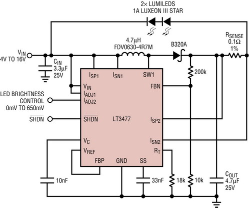 圖3所示的LT3477降壓-升壓型LED驅(qū)動(dòng)器以1A電流驅(qū)動(dòng)兩個(gè)大功率LED。這兩個(gè)LED無需以地為基準(zhǔn),連接的兩個(gè)端子一般是轉(zhuǎn)換器的輸出和電池輸入。LT3477有兩個(gè)獨(dú)特和具100mV浮動(dòng)電流檢測輸入引腳,這引腳連接與LED串串聯(lián)而且不以地為基準(zhǔn)的電流檢測電阻。在汽車電池的工作電壓范圍內(nèi)以及低于這個(gè)范圍時(shí),在電流直到1A的情況下都可實(shí)現(xiàn)準(zhǔn)確的LED穩(wěn)流。LT3477的停機(jī)引腳用于實(shí)現(xiàn)車燈的接通/斷開功能,并在未使用時(shí)將輸入電流降低到1uA(典型值為100nA)。IADJ引腳用來為后部信號指示燈或剎車燈等剎車燈和尾燈應(yīng)用實(shí)現(xiàn)高于10:1的模擬調(diào)光比。這類應(yīng)用無需真彩PWM調(diào)光。