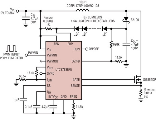 如圖4所示,大功率LED驅(qū)動(dòng)器LTC3783采用降壓-升壓型拓?fù)?,?qū)動(dòng)6至10個(gè)3W紅光LED,用于汽車尾燈應(yīng)用。外部開關(guān)MOSFET和開關(guān)電流檢測電阻為大功率和高壓LED驅(qū)動(dòng)器設(shè)計(jì)提供了最大的設(shè)計(jì)靈活性。如果電池電壓降至低于9V,那么9V至36V輸入和在電流為1.5A時(shí)高達(dá)25V的LED串輸出需要100V的額定開關(guān)電壓和高于8A的峰值開關(guān)電流能力。在整個(gè)汽車電池電壓范圍內(nèi),1.5A恒定電池電流是良好穩(wěn)定的。就剎車燈和尾燈調(diào)光而言,在100Hz時(shí),可以用直接連接到LTC3783PWM引腳的PWM信號降低LED電流,以實(shí)現(xiàn)高達(dá)200:1的調(diào)光比。在1kHz時(shí),調(diào)光比降低至?20:1,這對尾燈應(yīng)用來說已足夠了。調(diào)節(jié)ILIM引腳也可以降低LED電流。