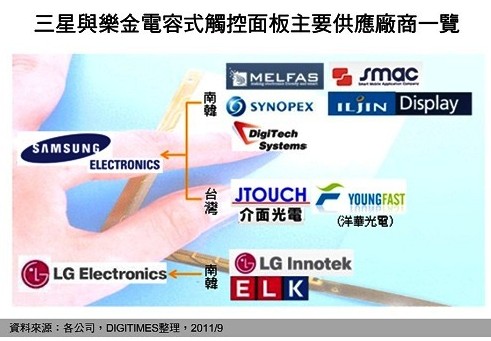 DIGITIMES Research 分析,相較于樂金主要向韓廠LG Innotek與ELK (Electro Luminescence Korea)采購觸控面板,三星不僅向Melfas、SMAC (Smart Mobile Application Company)、Synopex、Iljin Display、Digitech Systems、Moreens等韓廠采購,亦向日廠、臺(tái)廠與大陸業(yè)者采購觸控面板,可知三星于觸控面板采購多角化發(fā)展較樂金顯著。