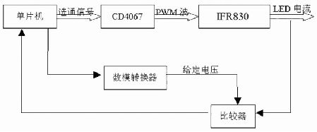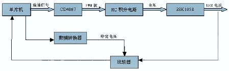 由于LED 的亮度與正向電流成正比,因此采用調節電流來改變亮度。通過調節電流來調節LED 亮度的方式有兩種: (1 ) 調節工作電流方式。(2 ) 脈寬調制(PWM)方式。