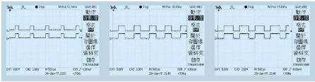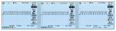 在計算機操作界面上,對第一路的DAC0832 輸入為100, 第二路為200, 第三路的電流值為255,測得對應支路LED 的電流值為54mA、106mA、134mA,對應2SK1058 的驅動波形分別圖4 所示。