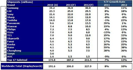 如下表所估計(jì),2011年前十六大品牌之合計(jì)出貨量為1億8,700萬(wàn)臺(tái),占 2011年全球的出貨的91%,但較2010年前十六大品牌的出貨合計(jì)只成長(zhǎng)了7%,根據(jù) DisplaySearch 的估計(jì)2011年全球液晶電視出貨也只較2010年成長(zhǎng)8%,由此可見(jiàn)主要領(lǐng)導(dǎo)品牌的出貨達(dá)成與全球液晶電視的出貨實(shí)績(jī)息息相關(guān)。
