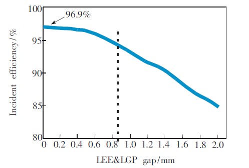 LED發光面和LGP入光面兩者之間的垂直距離通常會被忽略,但如果兩者之間的距離過大,也會嚴重影響入射效率。通過試驗發現,兩者之間的距離在±0.2mm范圍內時,入射效率變化緩慢,且保持在95%左右,所以控制LED發光面和LGP入光面的垂直距離在±0.2mm范圍內即可。