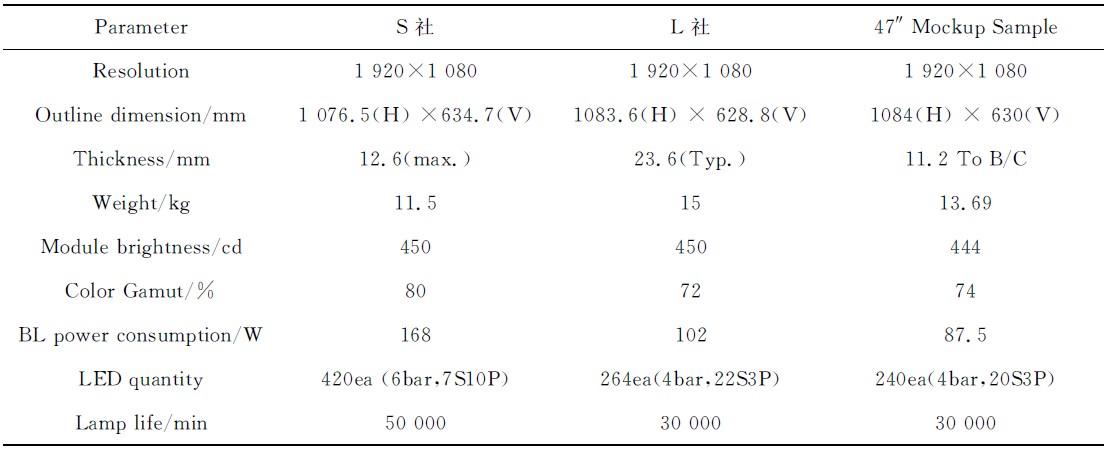 本文中設計的樣品在保證了光學性能的前提下,實現了低功耗的目標,達到了《平板電視能效限定值及能效等級》中規定的一級能耗,產品的厚度和色域也具有一定的優勢。