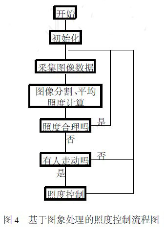 基于圖像處理的程序流程圖如圖4 所示。初始化系統后, 經過采集圖像數據, 將采集來的數據進行計算:先進行圖像分割, 然后進行圖像特征提取,區分亮區和暗區, 計算平均照度。判別照度值是否符合要求:如果照度值符合要求, 重復采樣圖像數據; 如果照度值不符合要求, 就輸出控制信號來調節燈的亮度, 之后, 重復采樣圖像數據, 進行下一個循環。